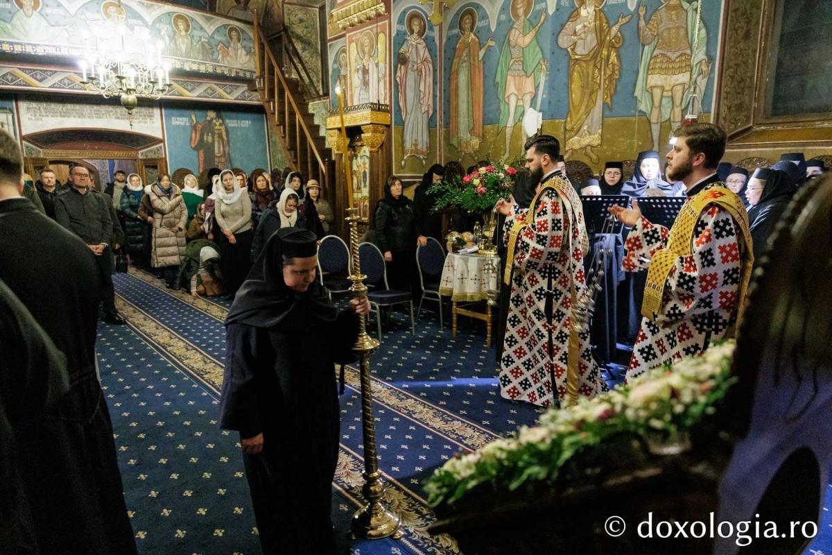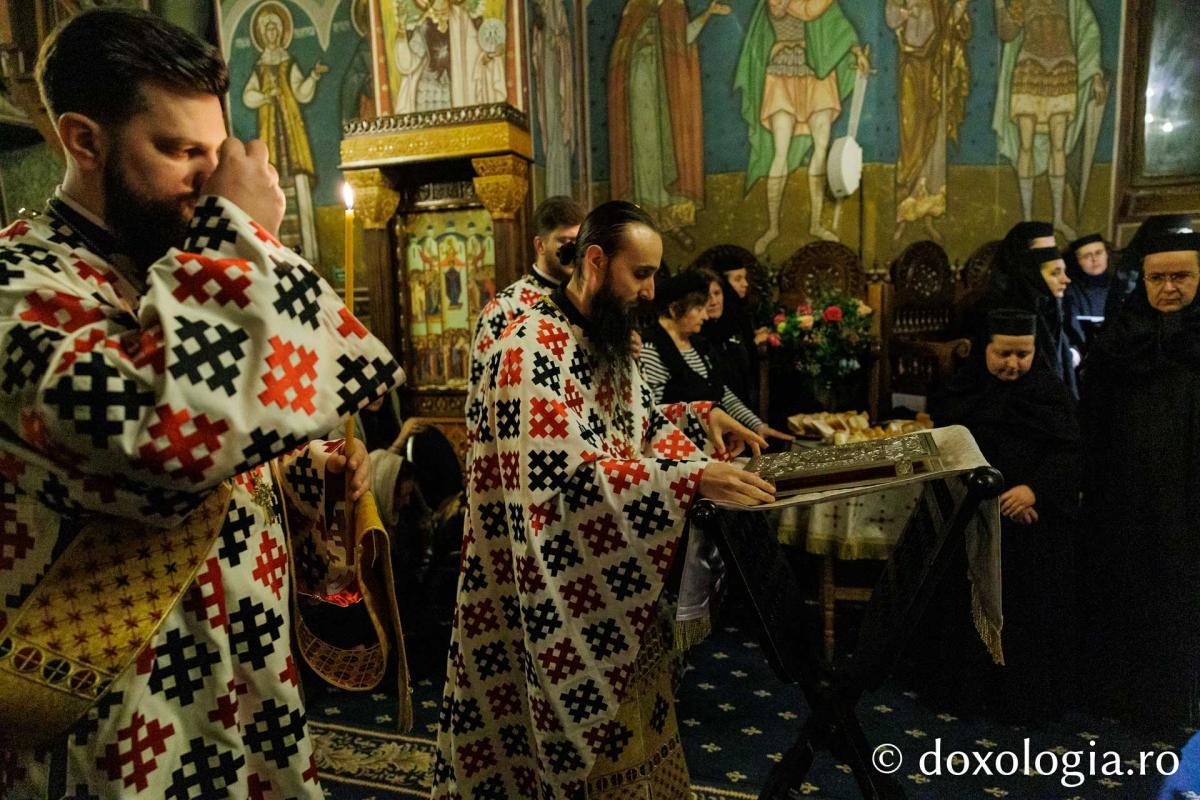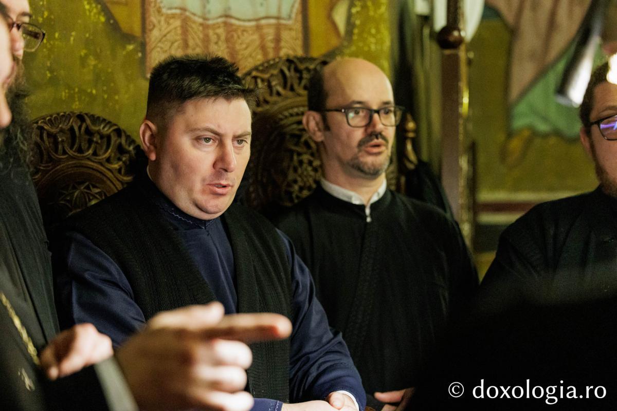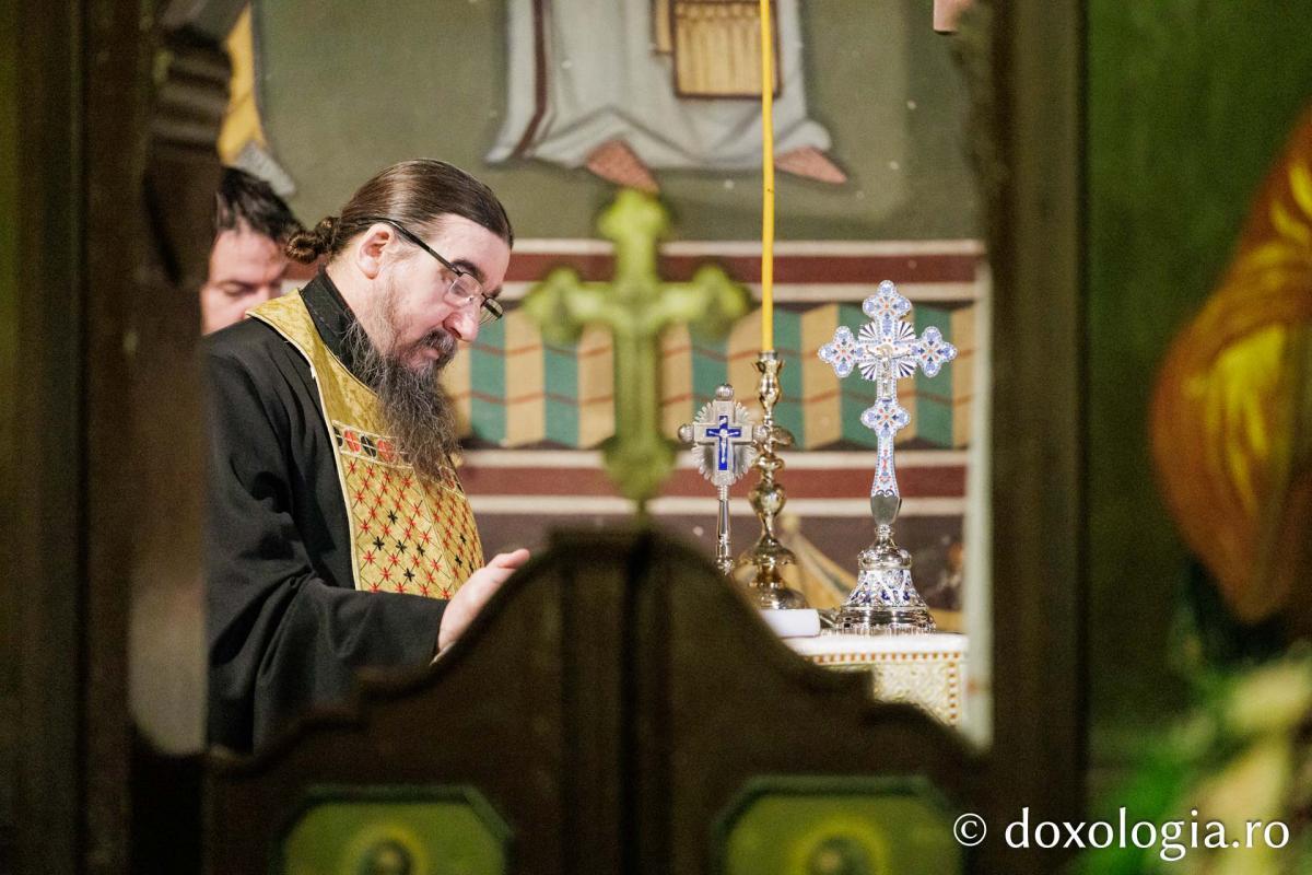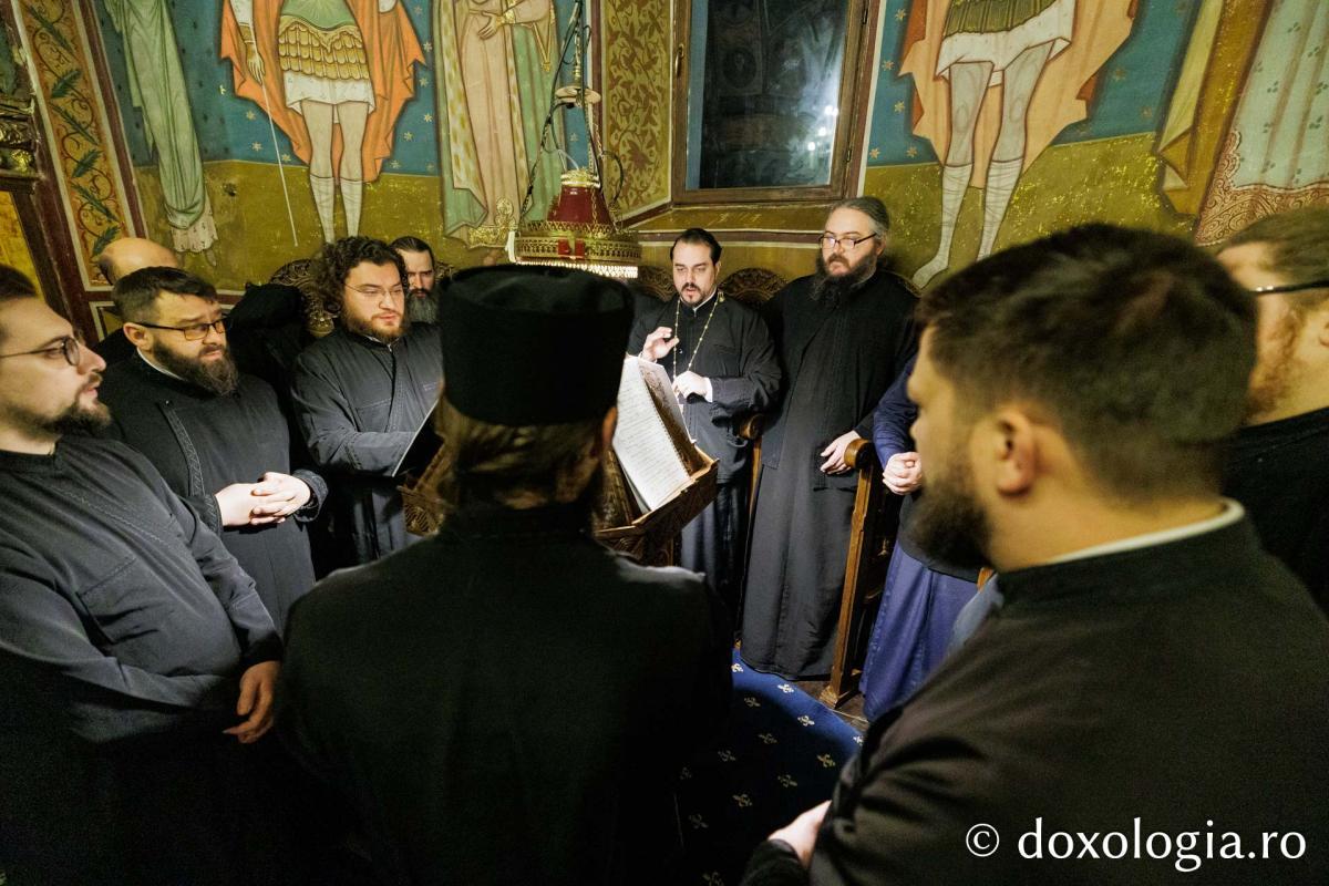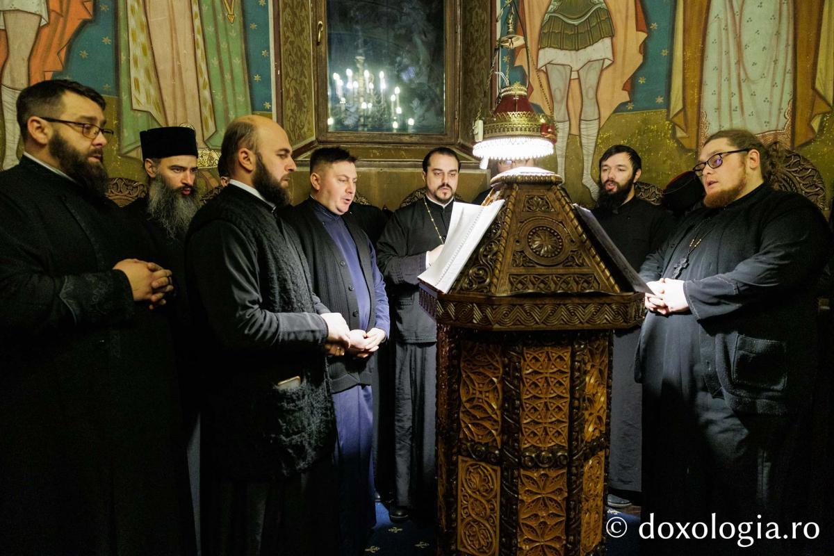 La slujba privegherii a slujit un sobor de preoți și diaconi sub protia părintelui arhimandrit Elisei Nedescu, starețul Mănăstirii „Sfinții Trei Ierarhi” din Iași, iar răspunsurile liturgice au fost date de Corul preoțesc „Apostolii” (în strana dreaptă) și, respectiv, de corul mănăstirii Copou (în strana stângă).