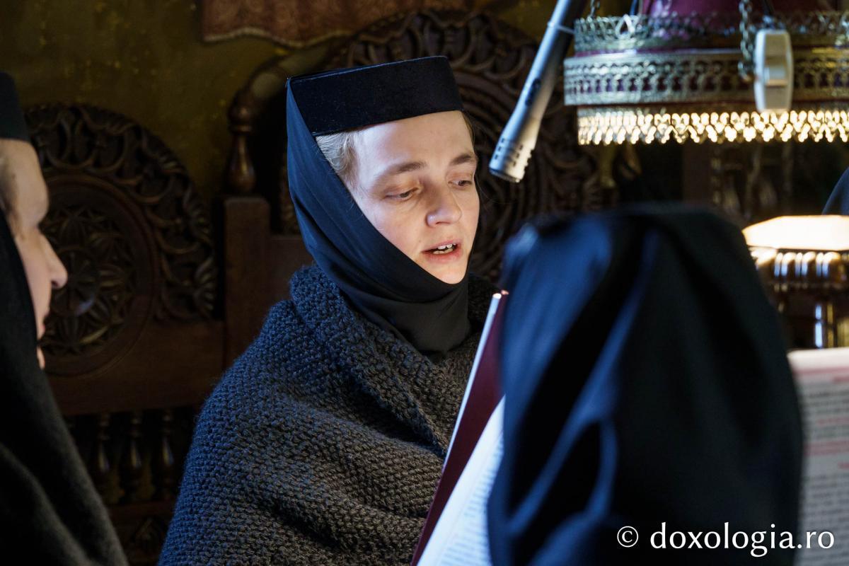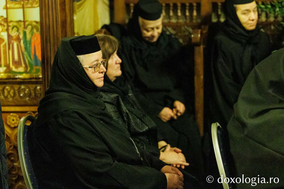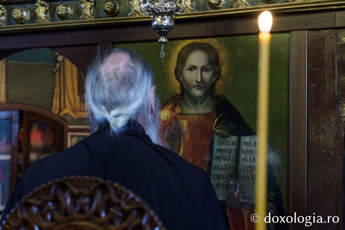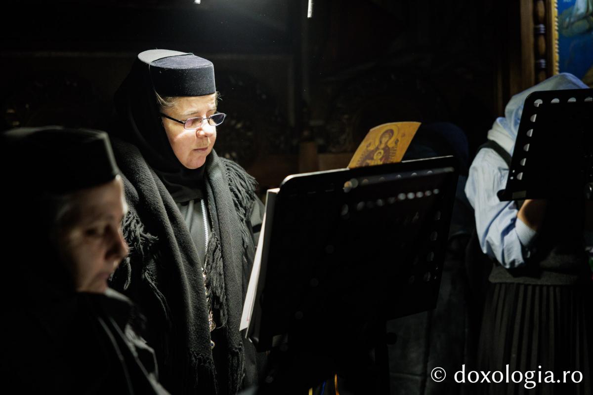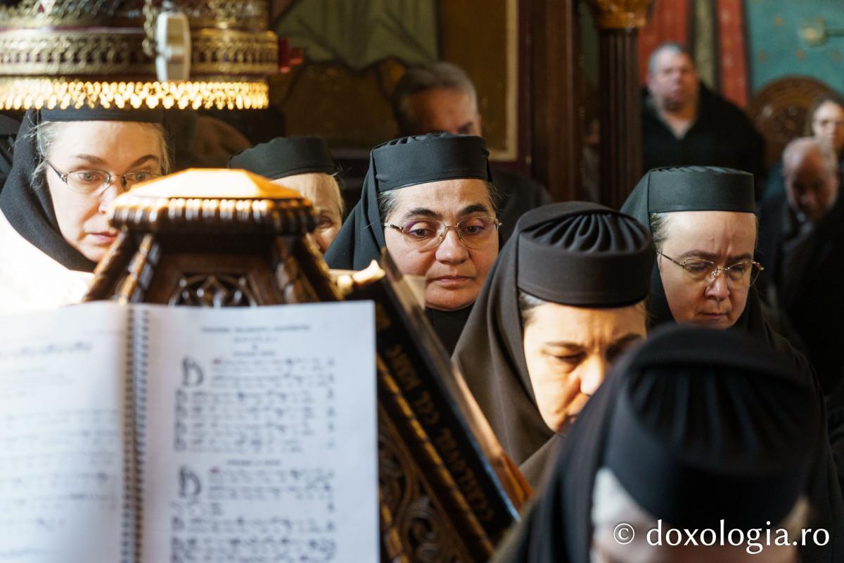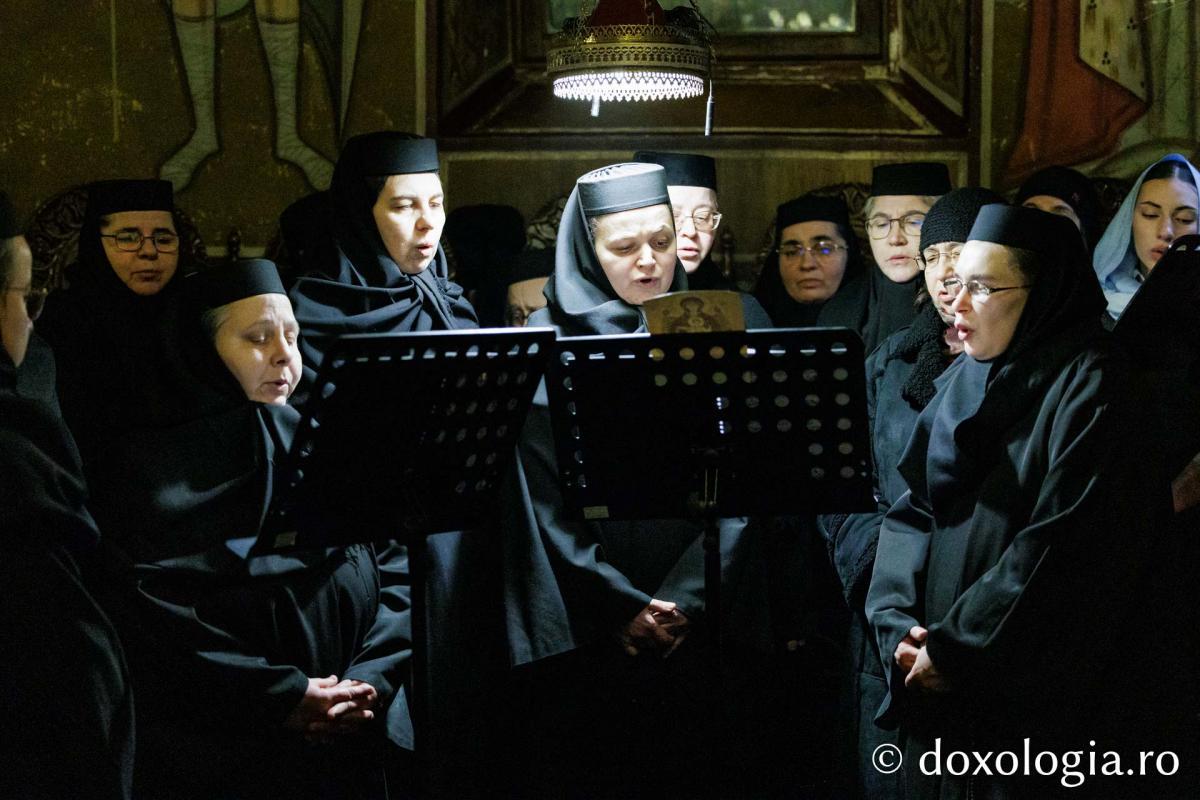 La slujba privegherii a slujit un sobor de preoți și diaconi sub protia părintelui arhimandrit Elisei Nedescu, starețul Mănăstirii „Sfinții Trei Ierarhi” din Iași, iar răspunsurile liturgice au fost date de Corul preoțesc „Apostolii” (în strana dreaptă) și, respectiv, de corul mănăstirii Copou (în strana stângă).